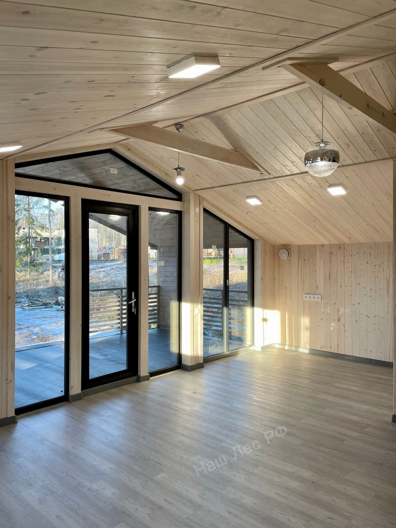 — Отделка наружных стен — вертикальна обшивочная доска (16мм). Вентилируемый фасад с прокладкой паропроницаемой ветровлагозащиты мембраной.