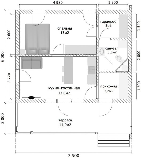 • Крытая терраса 2х7,5м, 2 лестницы на террасы в 4 ступени. Покрытие всех элементов террасы антисептическими лессирующими составами.